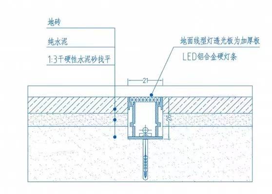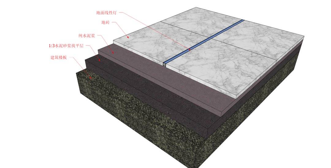 铺设水泥砂浆找平层→铺设水泥砂浆粘合层→铺设地砖留缝→固定型材→将LED灯带贴在型材槽内,盖上面罩并扣好堵头→连接电源,并通电调试,保证LED灯正常运行→盖上盖板,做好保护。