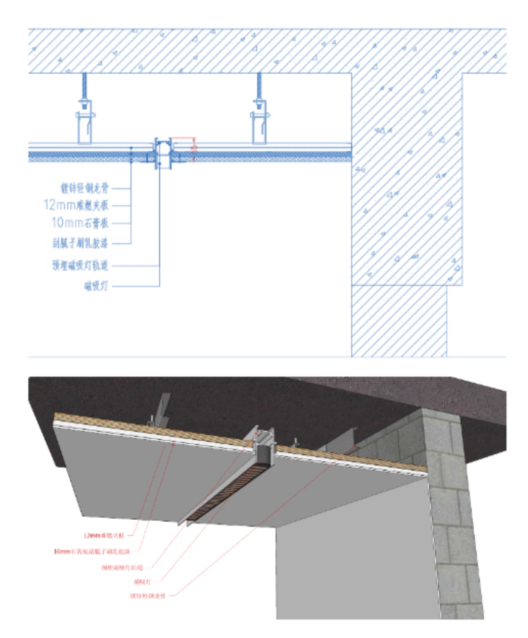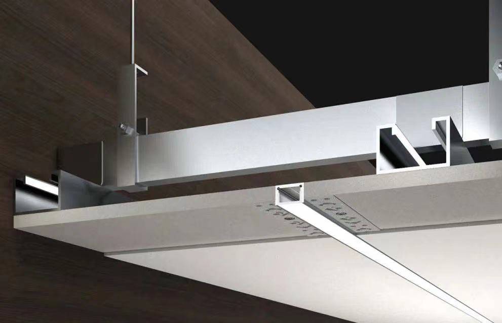 ① 在石膏板吊顶阶段,根据型材尺寸预留灯槽,并固定型材;