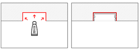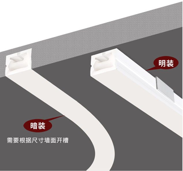 硅胶软灯带的安装方式有:悬挂式(吊杆/吊线)、吸顶式、嵌入式等多种安装方式,安装工艺都相对简便。我们今天以嵌入式的安装方式来讲解: