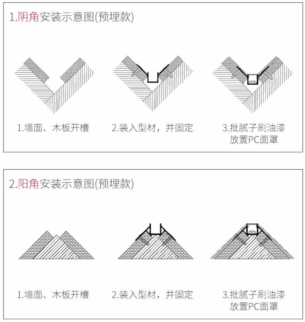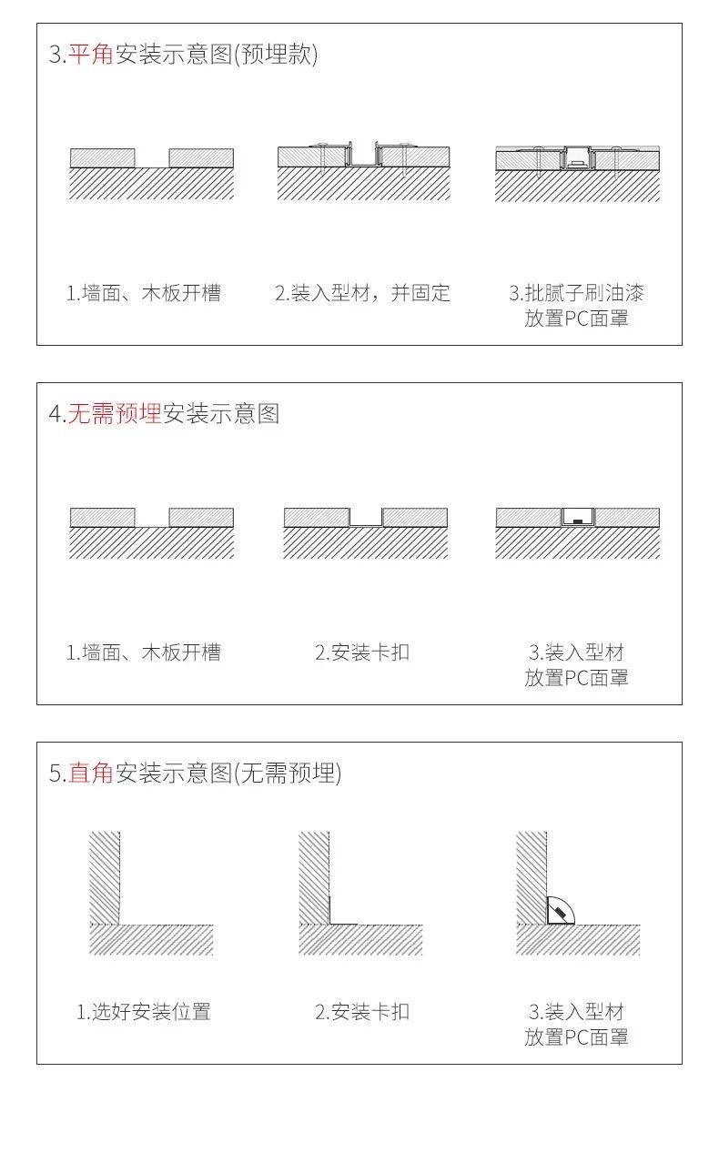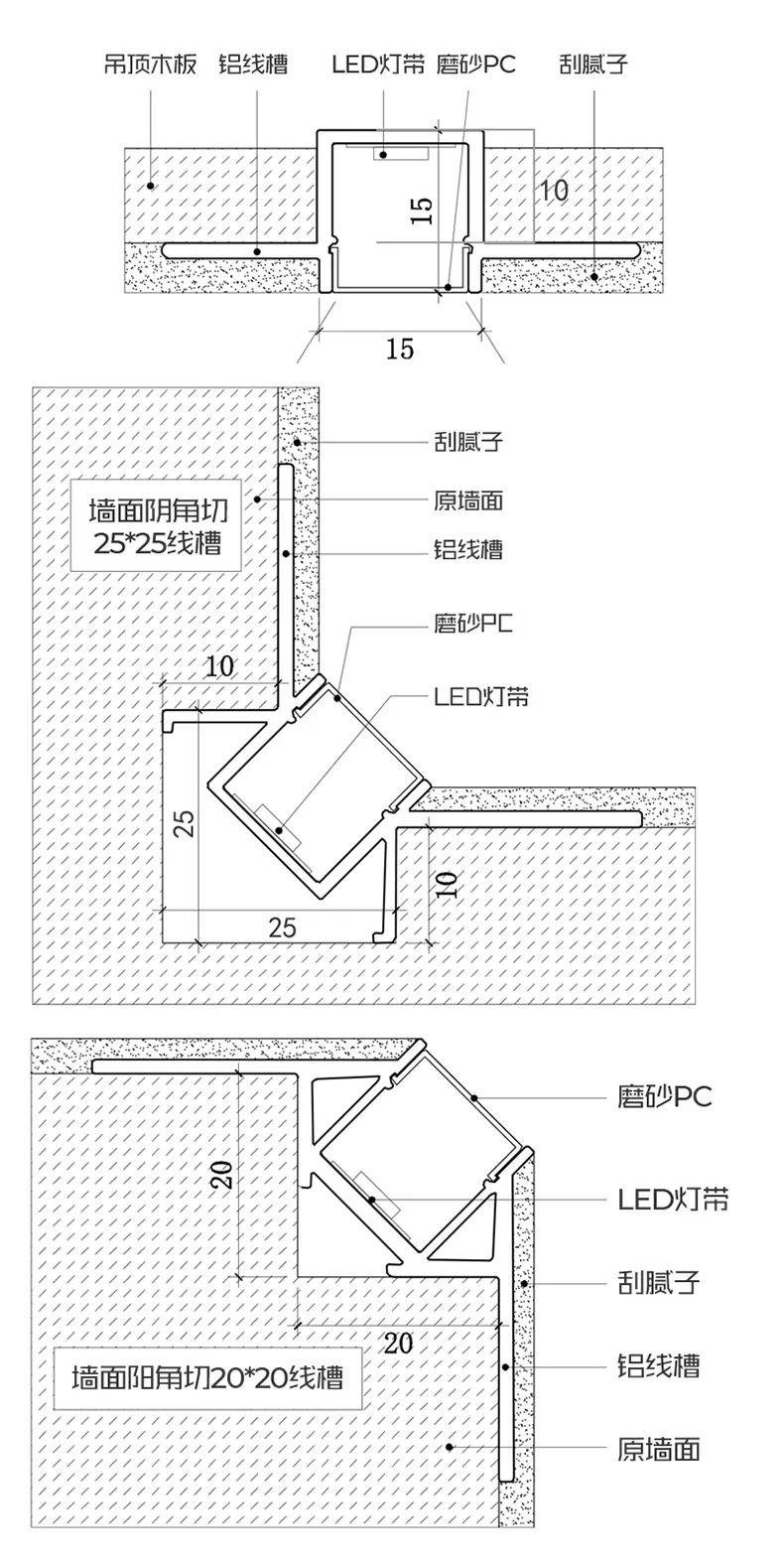 墙面嵌入式灯带,分为阳角、阴角、平角、直角以及无需型材预埋等几种形式,采用型材预埋的安装原理大致相同,施工简便。