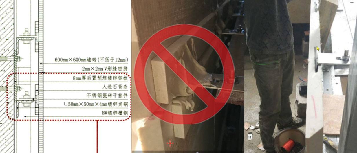 部分施工单位为节省成本,采用“胶粘修补”方式处理破损石材,导致挂点强度严重不足,存在脱落风险。