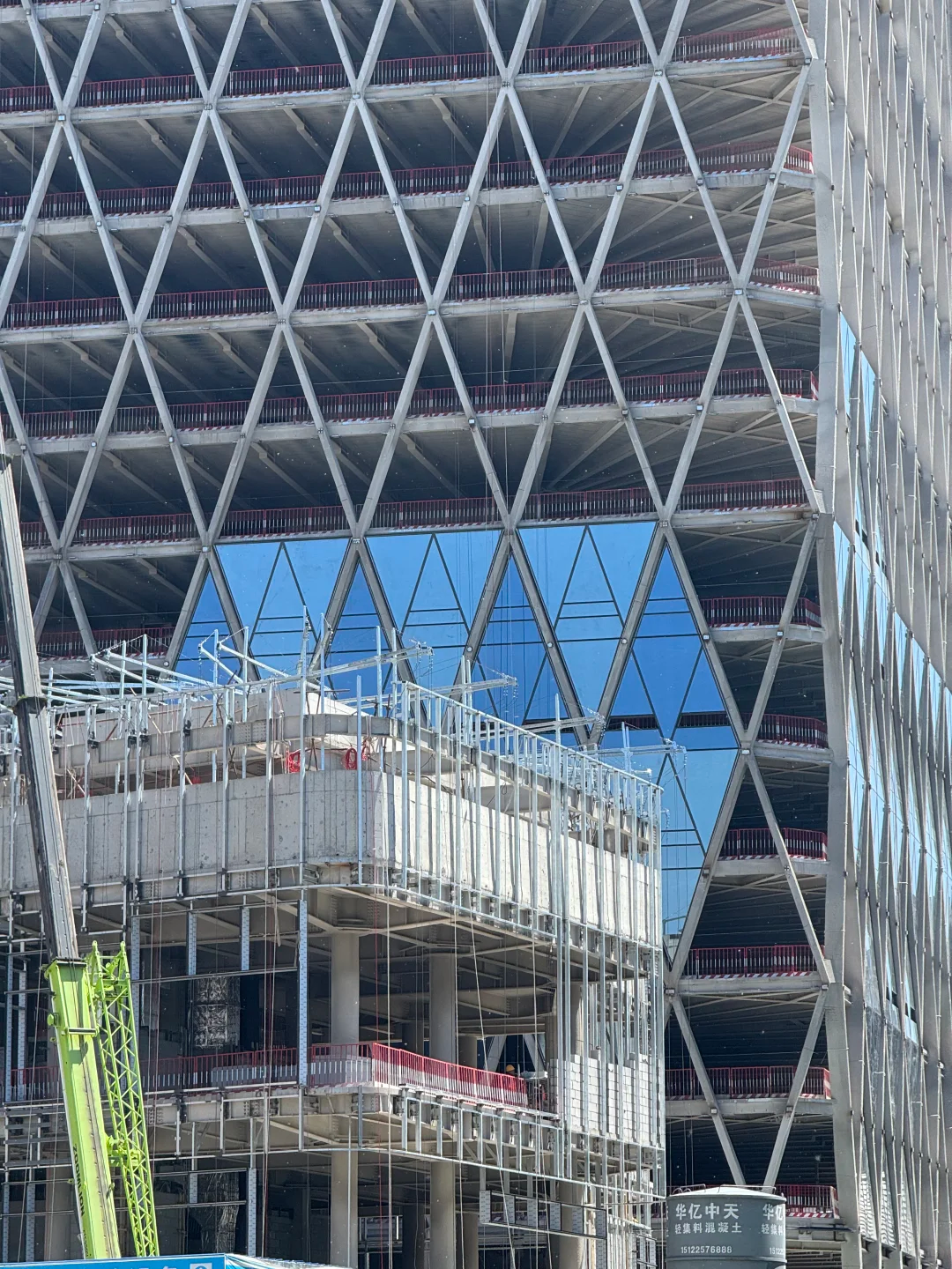 北京太古坊(Taikoo Place Beijing)全部8栋塔楼2025年10月16日结构封顶。继1-4号楼外立面幕墙先行落架后,此次封顶标志着滨水综合体全面转入机电安装与精装阶段,为2026年底的分期开业奠定关键节点。