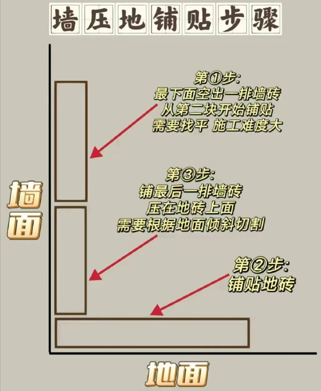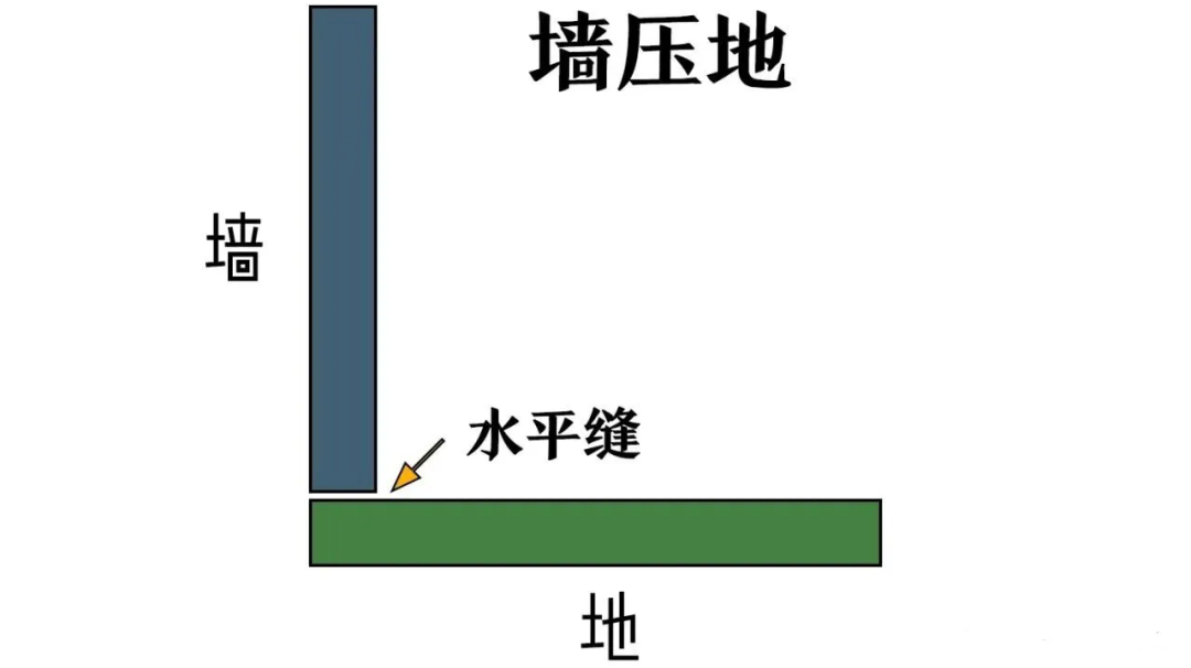 墙压地:墙砖贴到最下面,再把地砖插进去,墙根没朝天缝,水先落在地砖釉面,流进地漏,简单、直接、难漏。