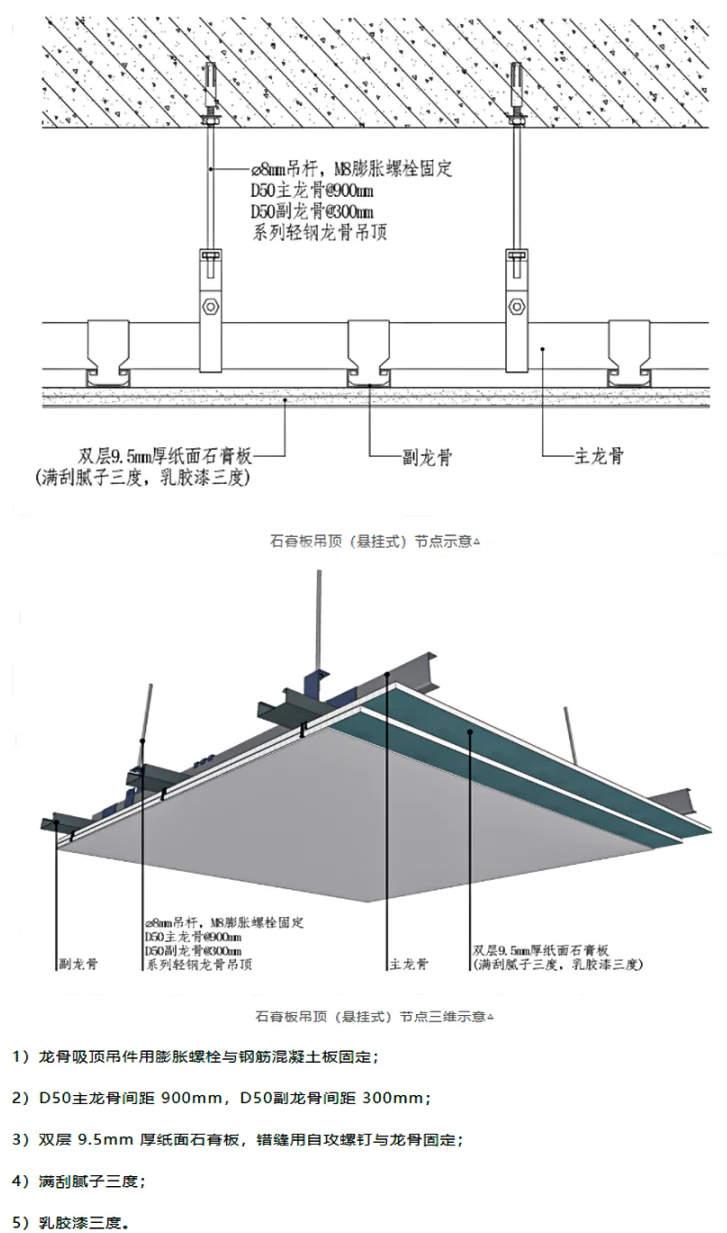 出于对安全、质量、美观等方面更高的要求,越来越多的项目上采用双层石膏板,行业内广为流传的室内节点规范出于指导施工和广泛应用考虑也将双层石膏板吊顶列为标准的工艺做法。