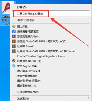 先找到你想要的CAD字体文件(字体!字体!字体文件!可以先复制一下文件),然后,鼠标右键选中CAD,选择【打开文件坐在位置】;