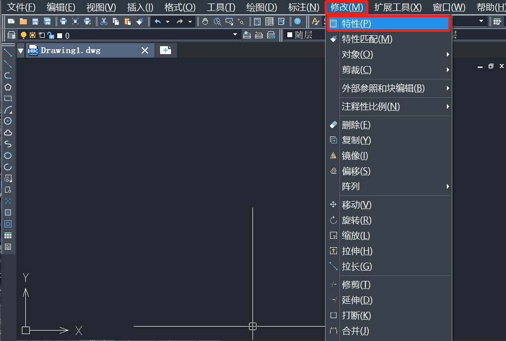 打开CAD——顶部菜单栏——选择【修改】—【特性】,调出特性工具栏。