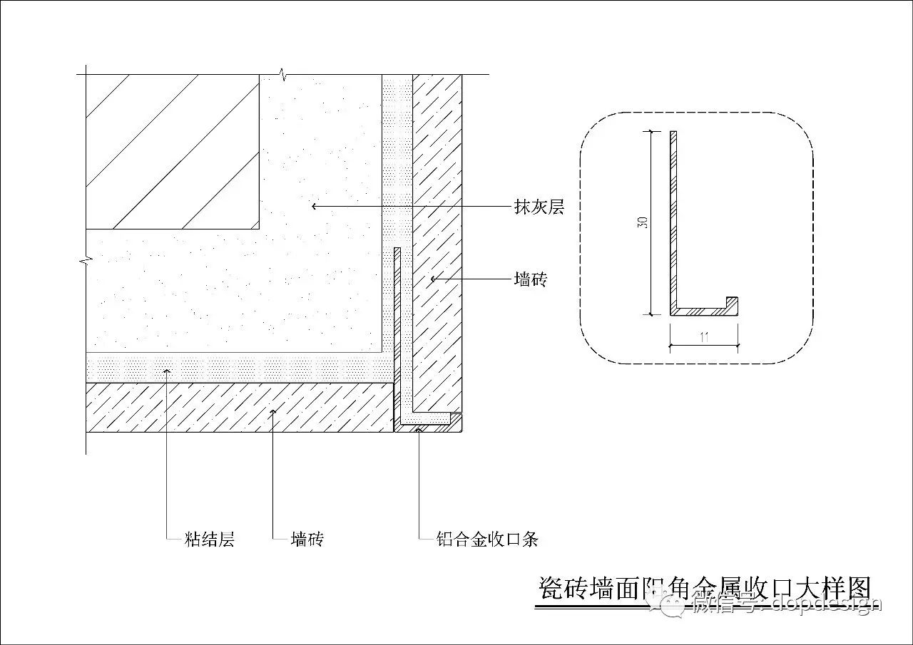 上图中第二个节点的收口做法,金属条可以为不锈钢板折边加工,这种样式同样可以使用在墙体阳角的收口。