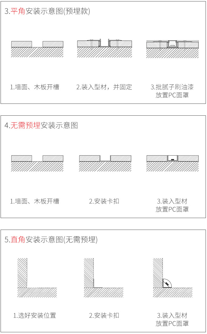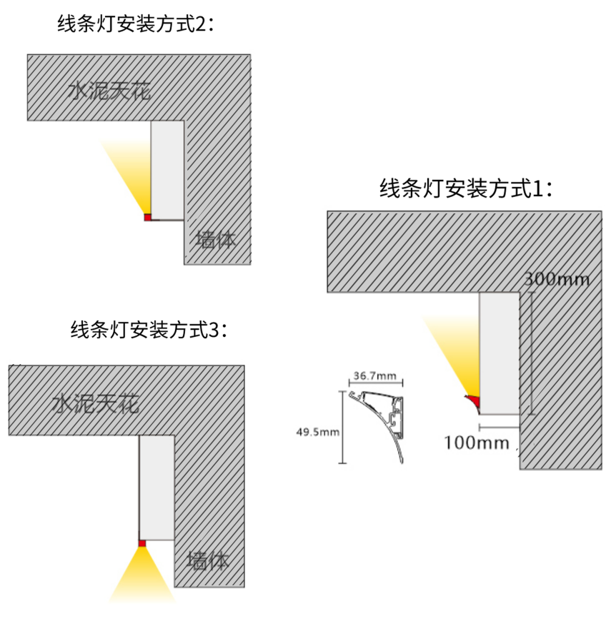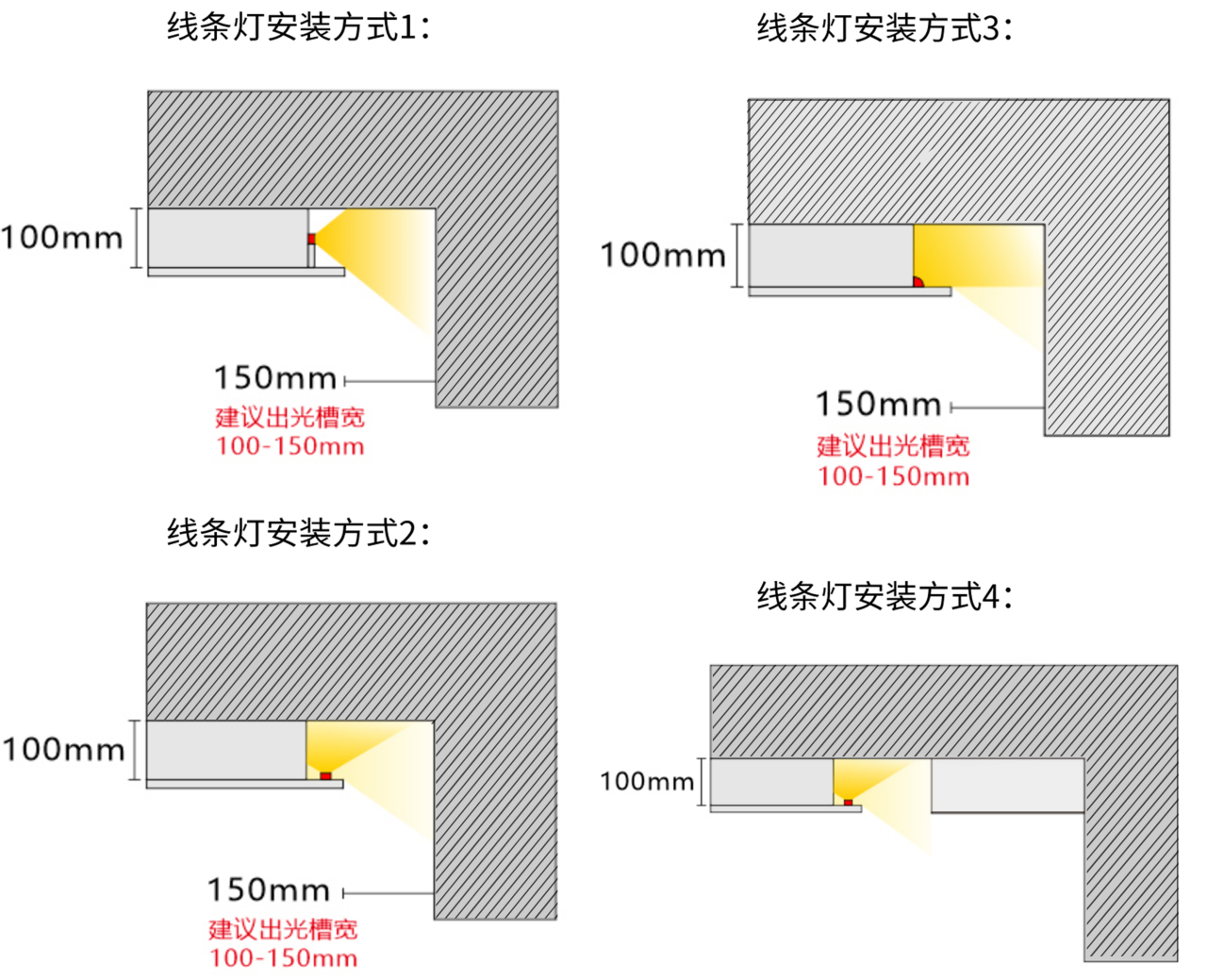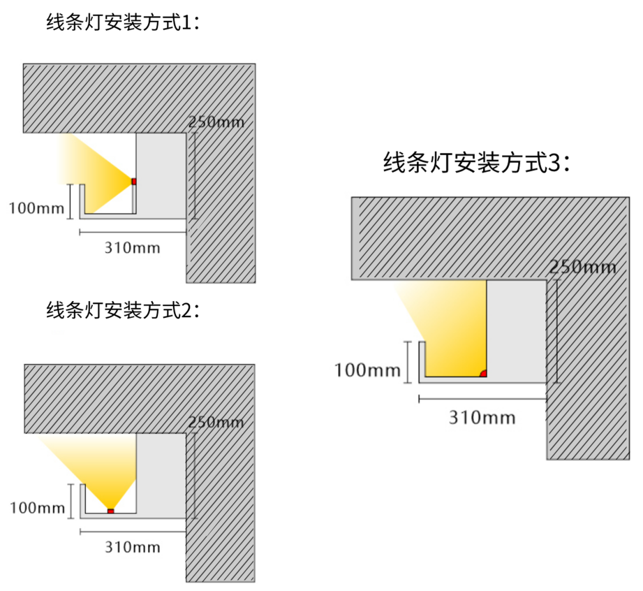 怎么样,下次客户再跟你反馈这个问题的时候,你就知道问题所在了吧,那下面我们来看一下不同空间线型灯安装示意: