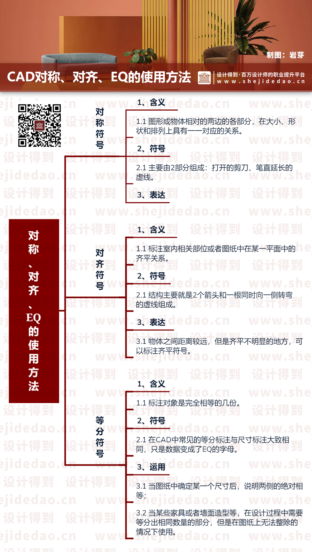 小结. 以上就是关于CAD中常见符号:对称、对齐、EQ的所有使用方法的相关内容,CAD的符号虽然不复杂,但是表达的内容可能会有一个或者多个内容,因此你最好的方法就是在绘制前或者看图前了解好全部的符号使用方法。 最后,这里推荐你到咱们设计得到官网的会员课程《从“零”开始,系统学CAD》中,学习掌握室内设计常见的符号使用方法课程,系统的学习CAD知识▽▽▽▽ △长按扫码,进入课程了解详情~ 会员免费学习哦 最后,导图总结如下: △点击保存,欢迎转发分享 △文中部分图片源于网络,如有侵权,请联系小编~