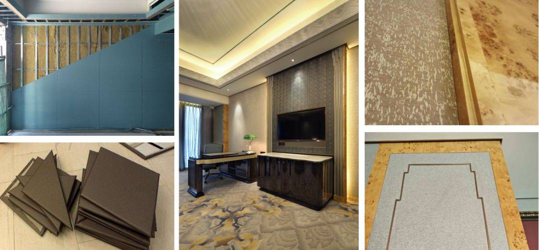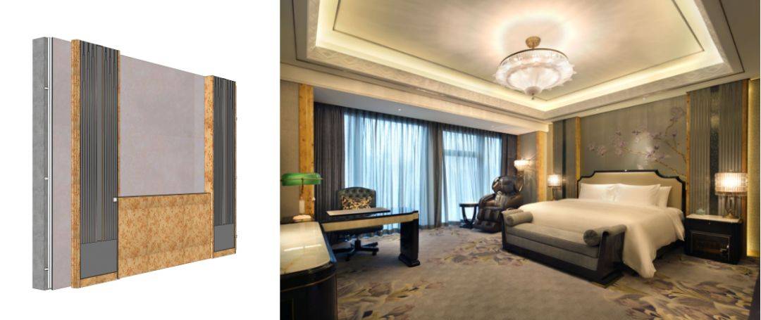 后场加工的运用举例:床背景造型现场不需要做基层,在后场直接加工成单元块,现场只需要进行安装即可。
