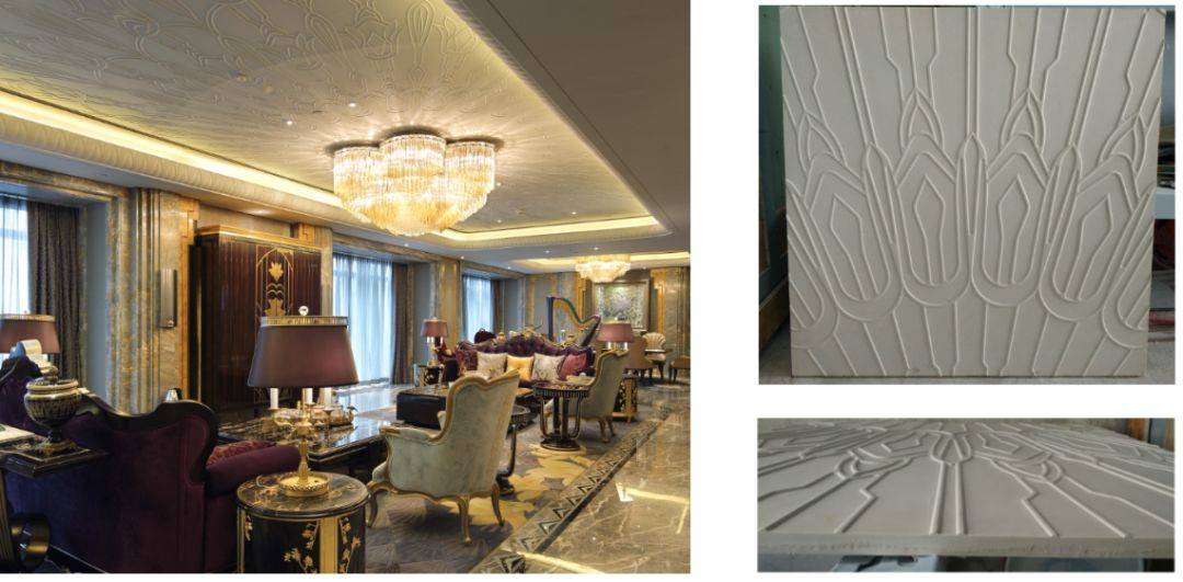 会客厅的GRG浮雕造型:轻钢龙骨外封多层板再安装GRG板,考虑到多层板的吃钉牢固度比较好,方便后期安装GRG板。
