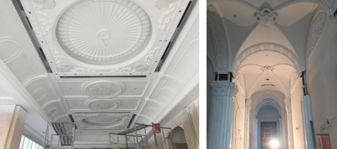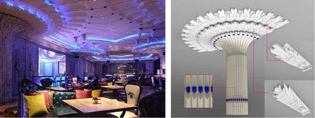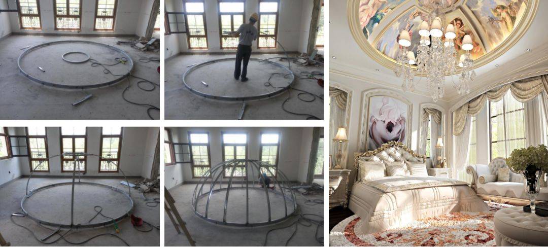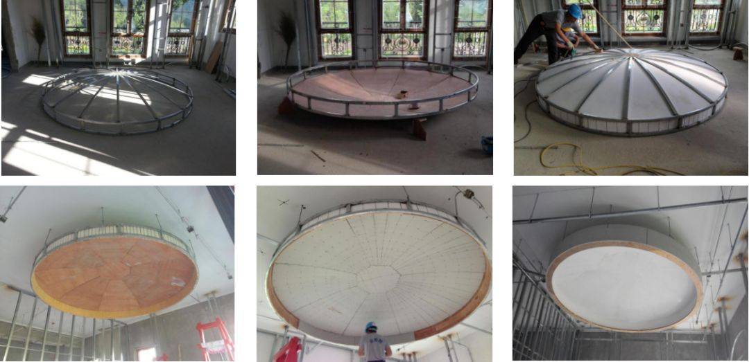 半圆GRG穹顶,使用钢骨架造型,面层封多层板,定制GRG的花板进行现场安装。