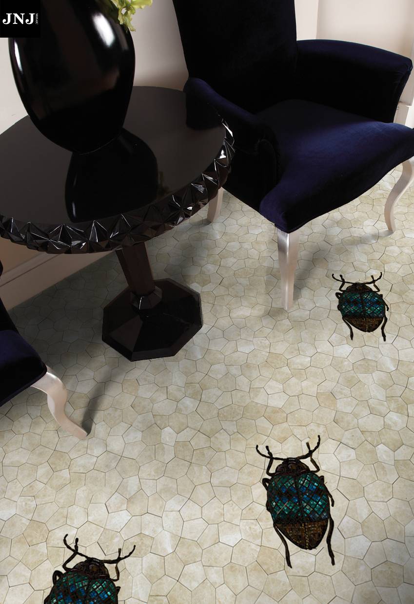 水刀作为一种传统工艺,打破常规铺贴方式和审美判定,突破采用错缝拼接和异性构图,使作品更为灵动。