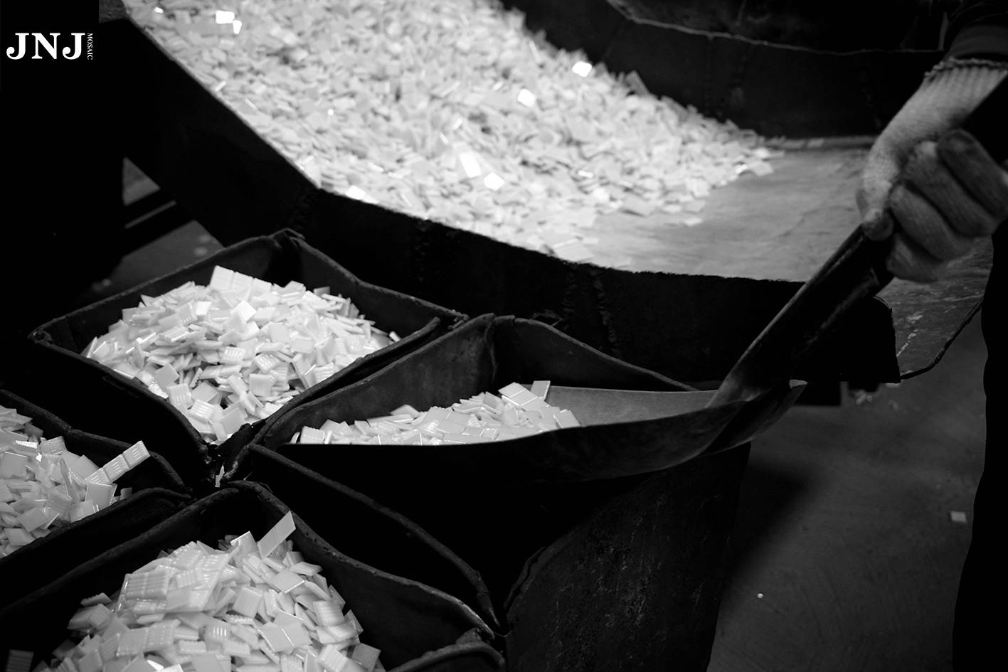 筛板作为一门传统的马赛克工艺,根据设计者的思维意识对马赛克进行撒色、筛色、跳色、填充、点阵、翻面、塑形等技法操作,从而形成数字化和像素化的色块构成图形。