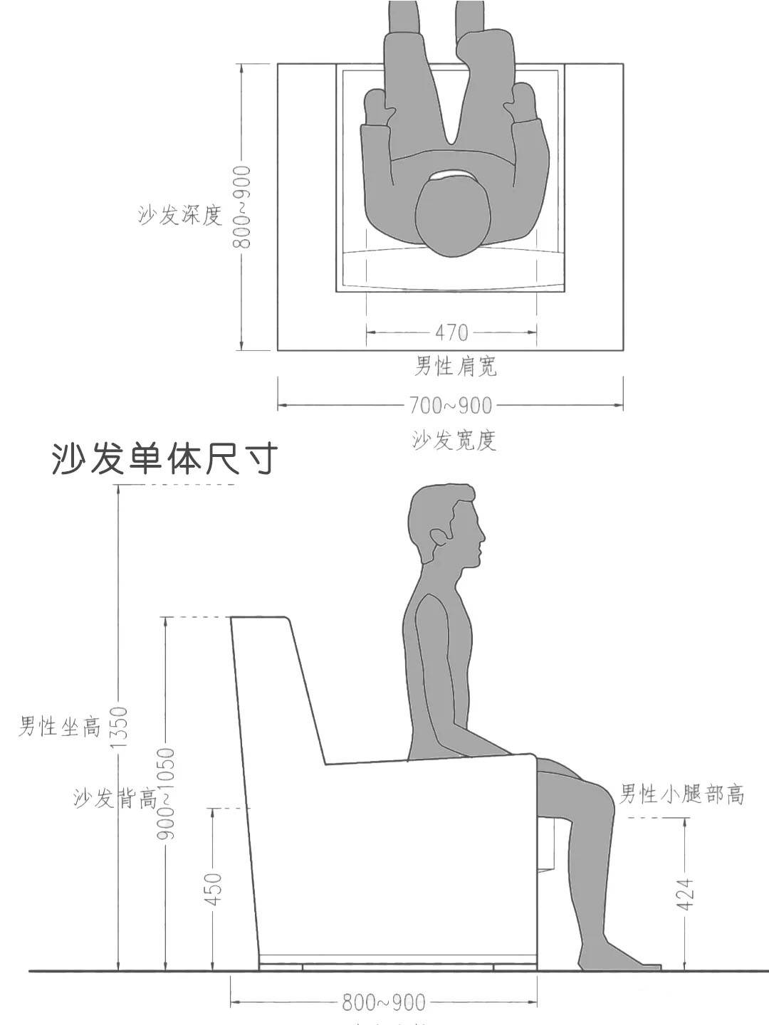 单人沙发长度约700-900mm,双人沙发1300-1600mm,四人沙发2800-3400mm,深度均集中在800-900mm,高度900-1050mm。