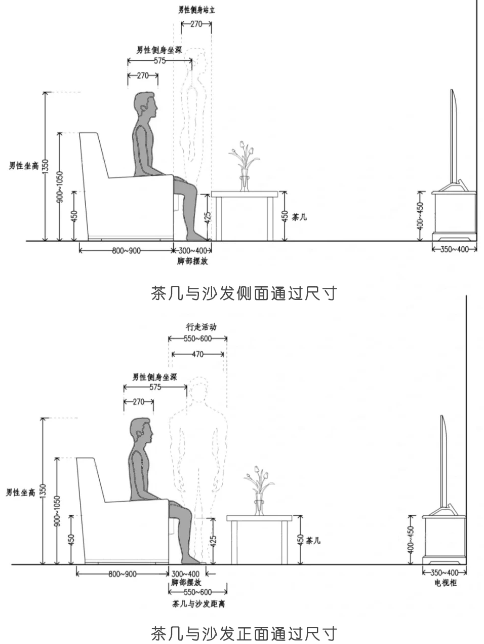 当人蹲下或弯腰时,所需活动空间高度为900-1000mm。站立更换时,侧身活动宽度不应小于450mm。