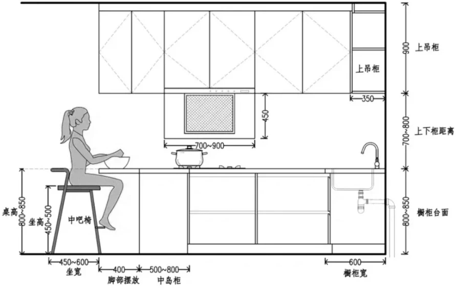 地柜深度600-650mm,吊柜深度300-350mm,且两者间垂直距离应保持700-800mm,以防碰头。油烟机与灶台距离控制在650-800mm。
