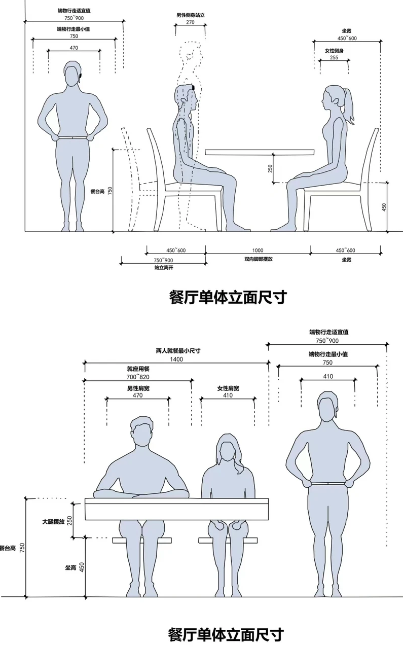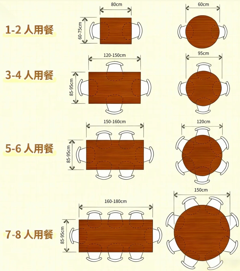 圆桌直径从二人位的500mm到十二人位的1800mm递进。需确保座椅就位后,餐桌间距仍大于500mm以保证通行。