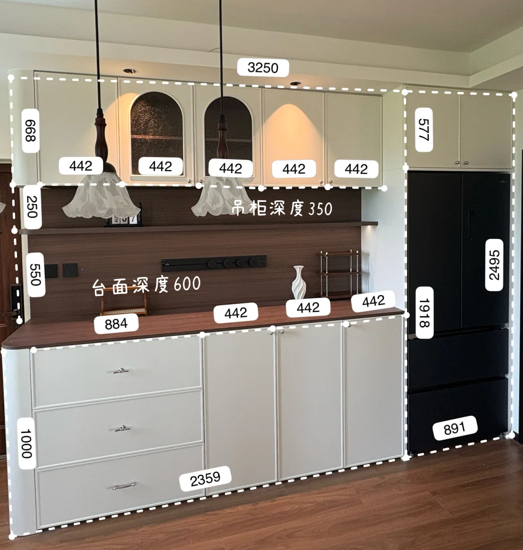 餐边柜台面高度为850-1000mm,上方吊柜应离台面500mm以上,深度350mm为宜。吧台高度设为900-1050mm,宽度500mm,搭配600-750mm高的吧凳。