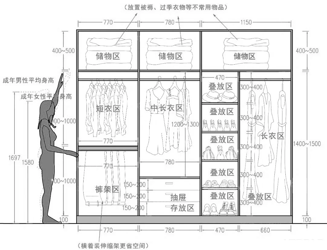 衣柜深度应为550-600mm,内部分区需明确:短衣区高度不低于1000mm,长衣区不低于1400mm,叠放区与裤架区分别以400mm和650mm为参考。