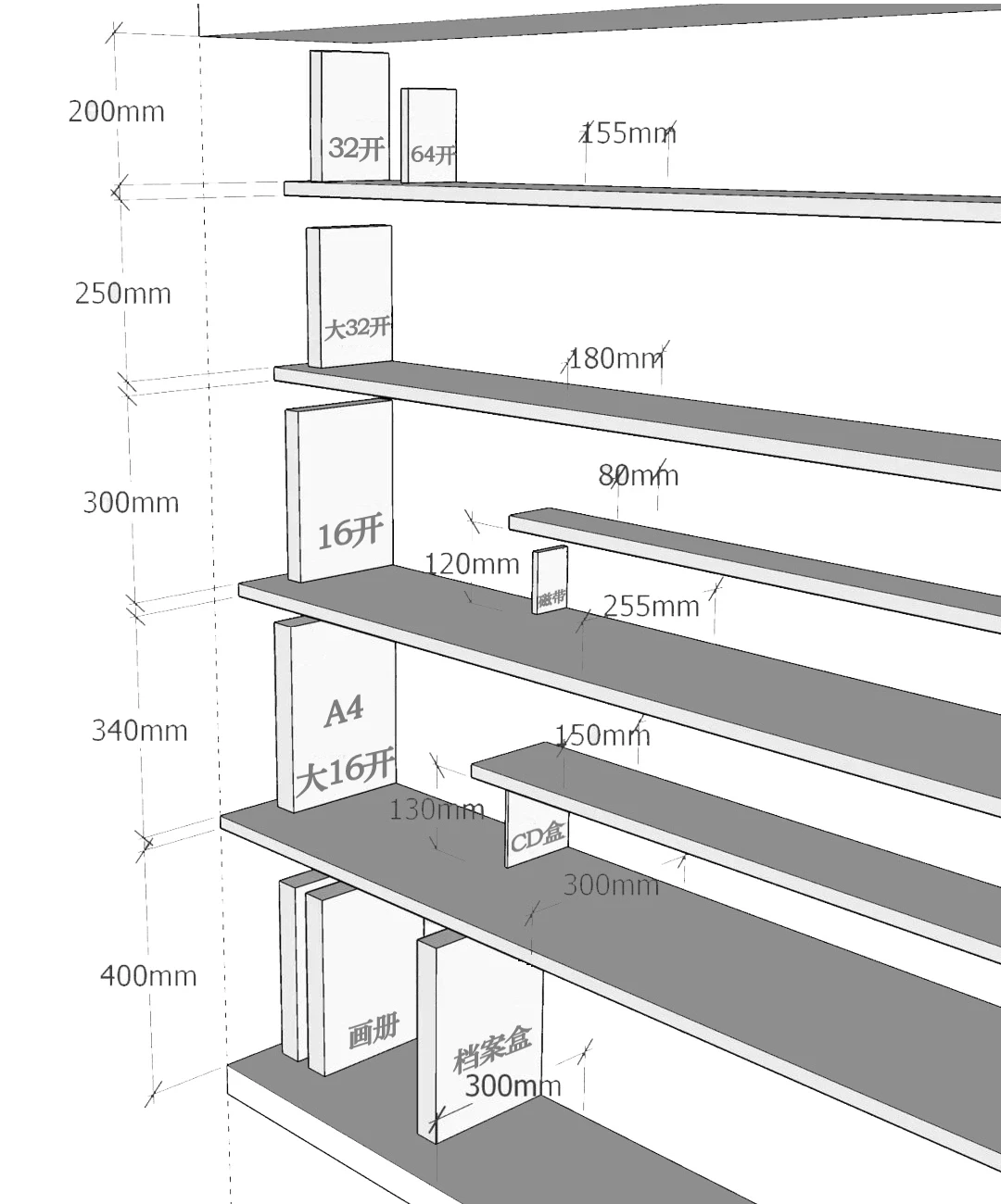 书柜层板间距以300-400mm为佳,书架深度通常为250-450mm。