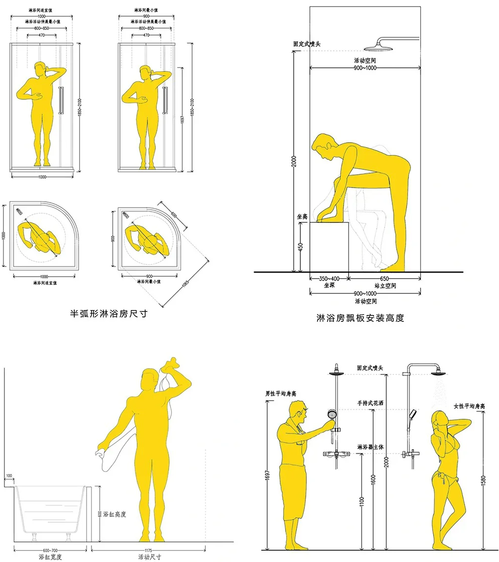 淋浴区宽度至少800mm,长度不低于900mm,花洒及淋浴器安装高度建议大于2000mm。浴室柜地柜含台面高度在300-850mm间调节,深度450-550mm。