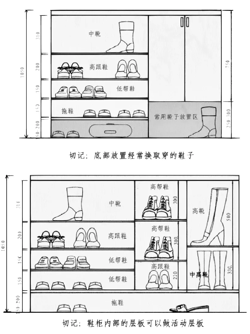 底部应预留250-300mm的悬空区,用于放置常换鞋履。
