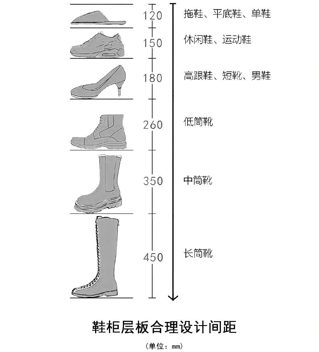 内部层板建议设置为可活动式,高度需严格分级:存放拖鞋、平底鞋的区域高度为120-150mm;休闲鞋、运动鞋及普通男鞋需150-180mm;高跟鞋与短靴区需180-200mm;低筒靴预留260-300mm;中筒靴需300-350mm;长筒靴则需预留至少400-450mm。