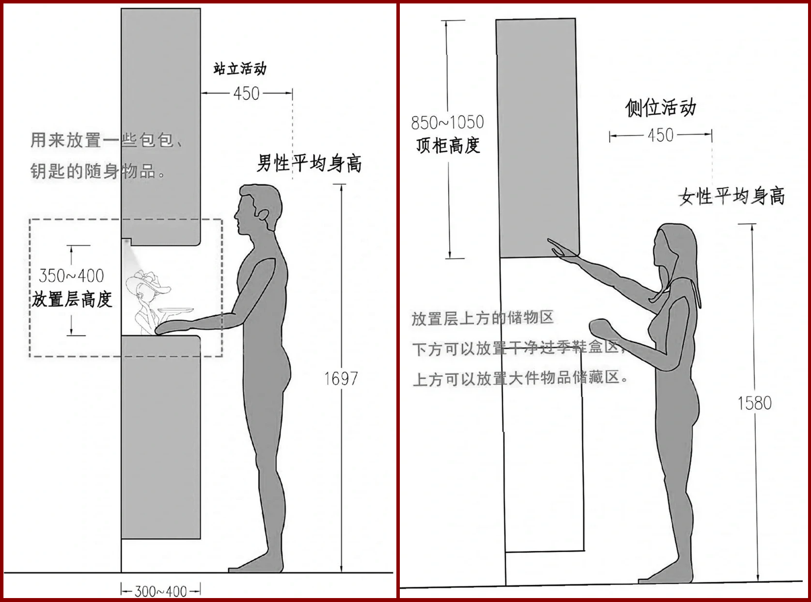 室内设计师若未掌握人体工程学,方案与施工图阶段将面临连锁问题:反复修改、功能失效、安全风险。例如,玄关鞋柜层板高度若未按鞋履分类精准设计,会导致客户入住后储物空间严重浪费或物品无法存放,引发拆改返工;厨房操作台高度与吊柜间距未按业主身高定尺度规划,可能造成使用者弯腰劳累或碰头事故。