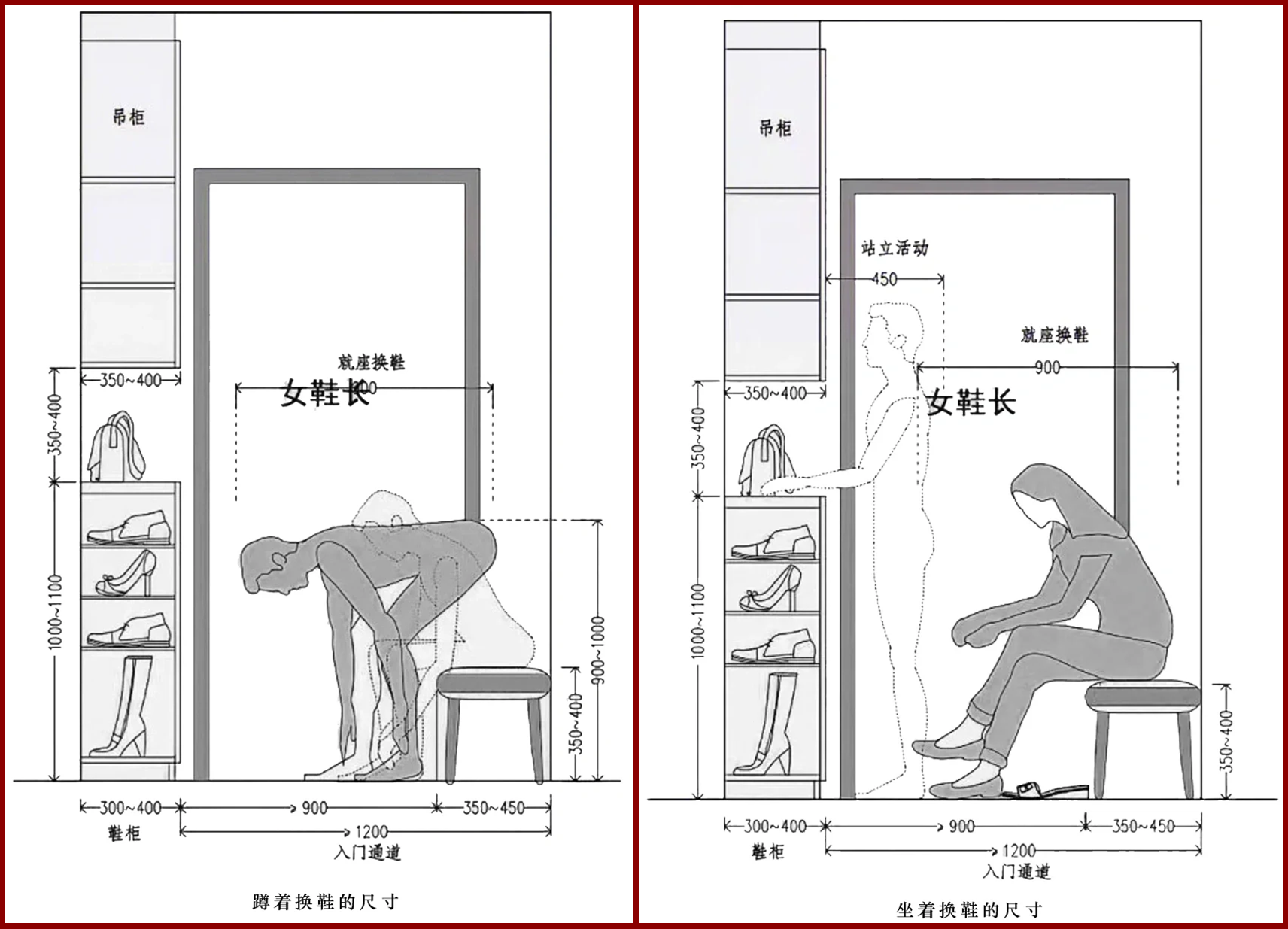 换鞋区需兼顾不同姿势的舒适尺度。 若设置换鞋凳,其高度应为350-450mm,与鞋柜间需留出350-450mm的间距以便就坐。