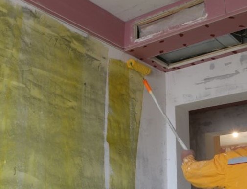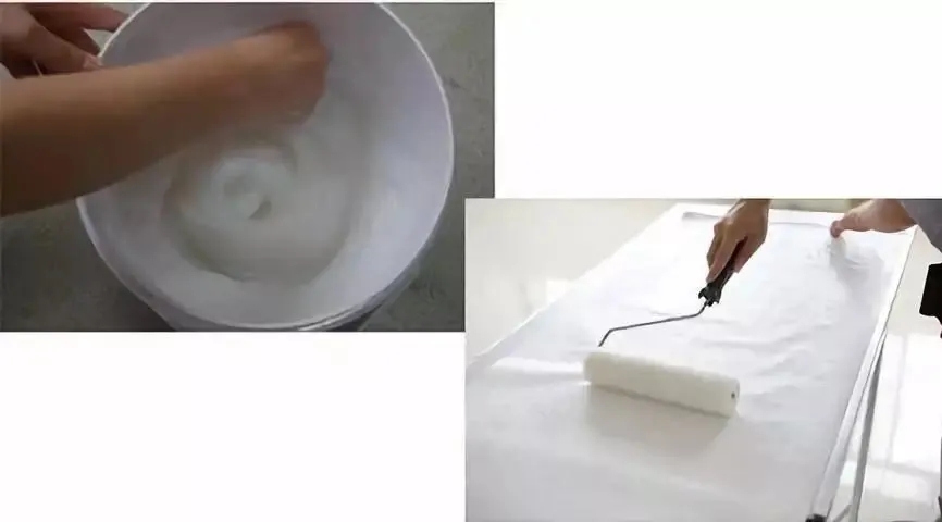 调制基膜液,用滚筒在墙面上刷满基膜。一般需要等待24小时,基膜彻底干透后才可以进行下一步铺贴。
