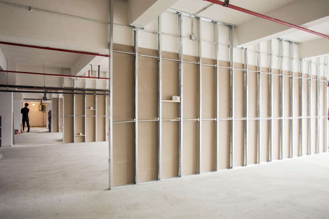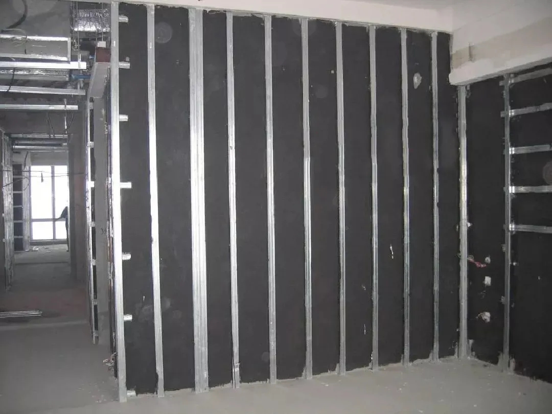 隐蔽检查,然后先安装一侧的纸面石膏板,安装电盒、电箱等附墙设备,接着安装墙体内防火、隔声、防潮填充材料,与另一侧纸面石膏板同时进行安装填入。
