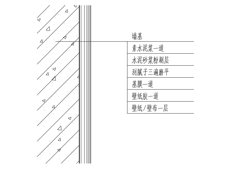 施工准备→基层处理→滚刷基膜→壁纸/壁布裁剪→调制、涂抹胶剂→壁纸/壁布铺贴→收边裁边→修整验收