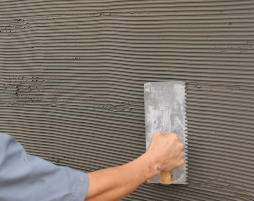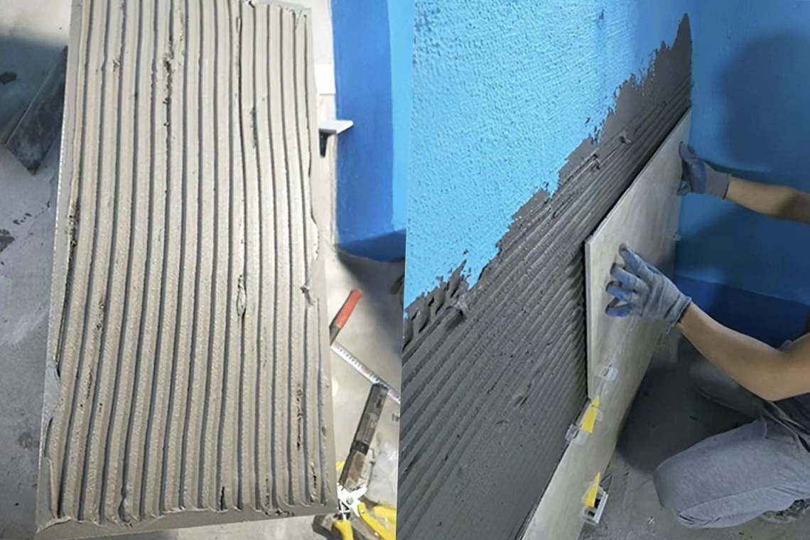 将搅拌均匀的瓷砖粘结剂,用齿型抹刀的直面,用力均匀批刮至墙面基层上。再用齿刀的齿面批刮纹路,使其均匀饱满。