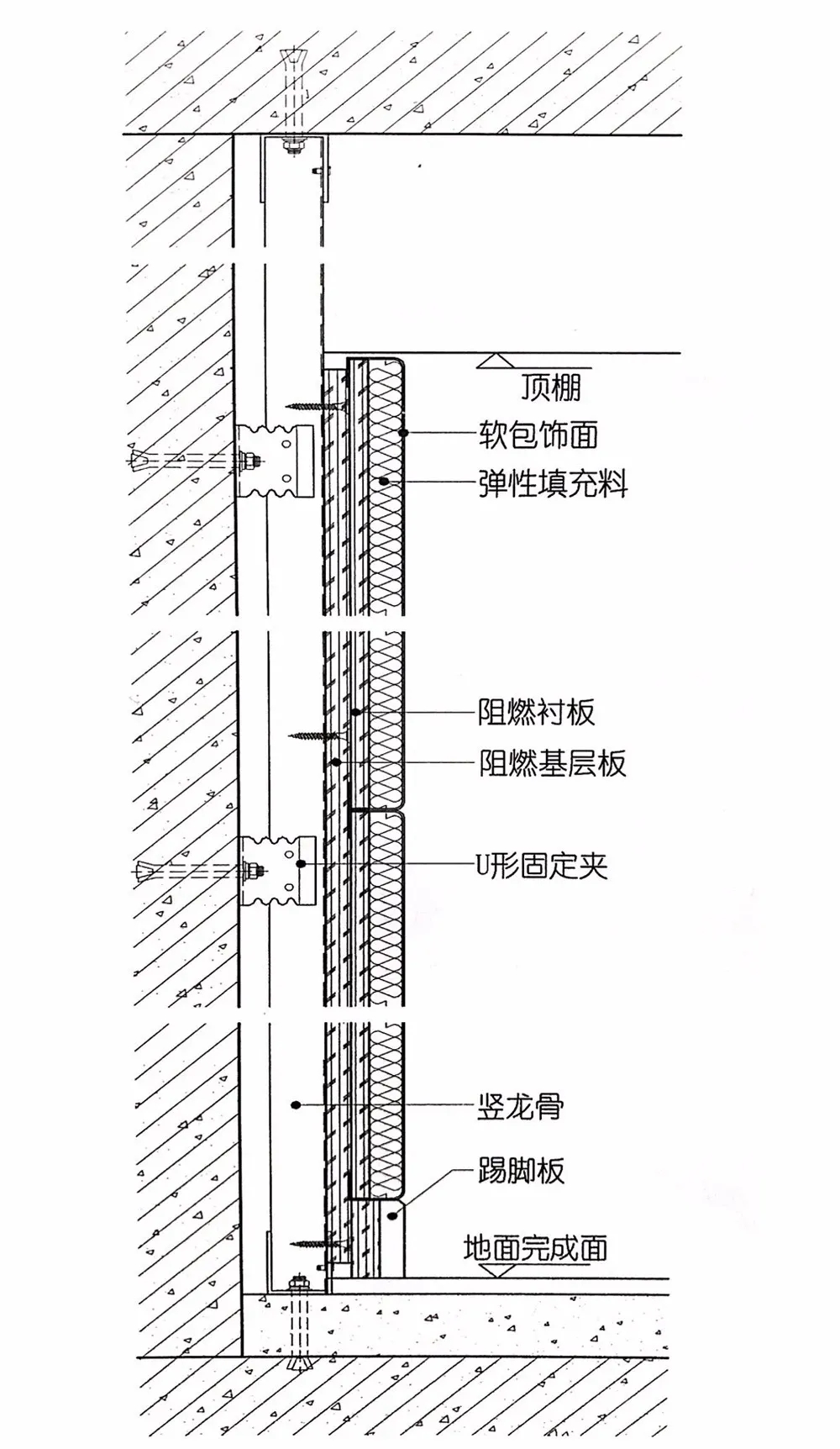 抹水泥砂浆找平层,对墙体作防潮、防腐、防火处理。基层骨架采用轻钢龙骨,底板可采用阻燃板基层板。轻钢龙骨通过U型支撑件与墙体预埋木砖连接,底板铺钉在轻钢龙骨上。