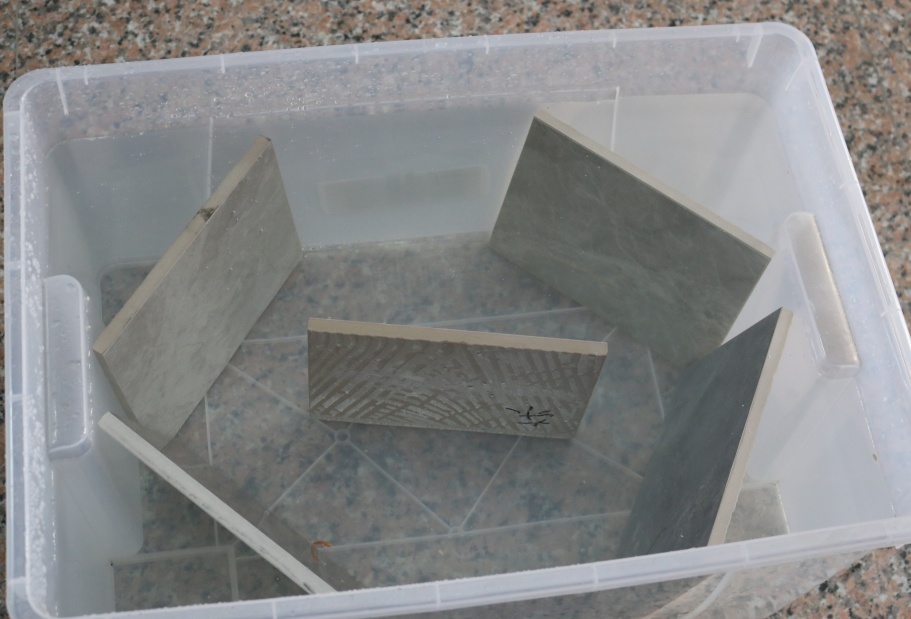 将存在色差、裂纹、破损、缺角等瑕疵瓷砖挑出,再将品质完好的瓷砖完全浸入水中,浸泡半个小时以上。