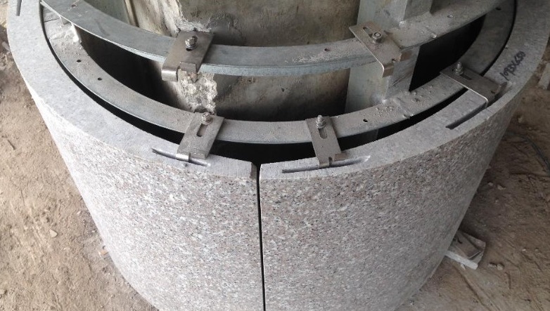 根据设计尺寸,将石材固定在专用模具上,进行石材上、下端开槽,背面开一企口以便干挂件能嵌入其中。