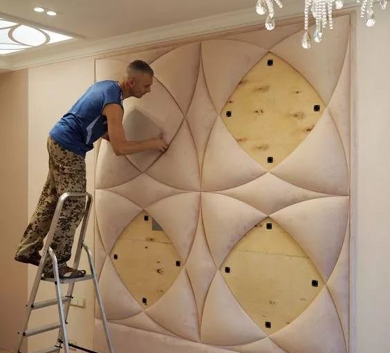 按照设计图纸和造型的要求把弹性填充物粘贴固定在预制软包装饰底板上。再把面料按照定位标志及设计要求粘贴。然后将软包装饰板,按设计图纸及试拼效果,用专业胶粘剂粘贴在底板(基层)上即可。