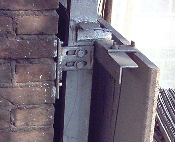 按照竖龙骨槽钢位置,确定预埋镀锌钢板位置,在混凝土梁、墙上用膨胀螺栓固定埋板。