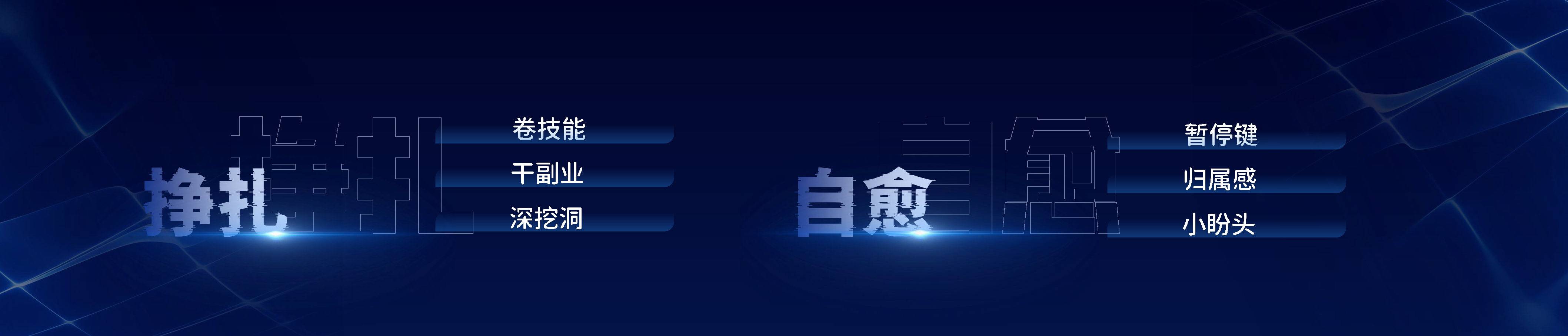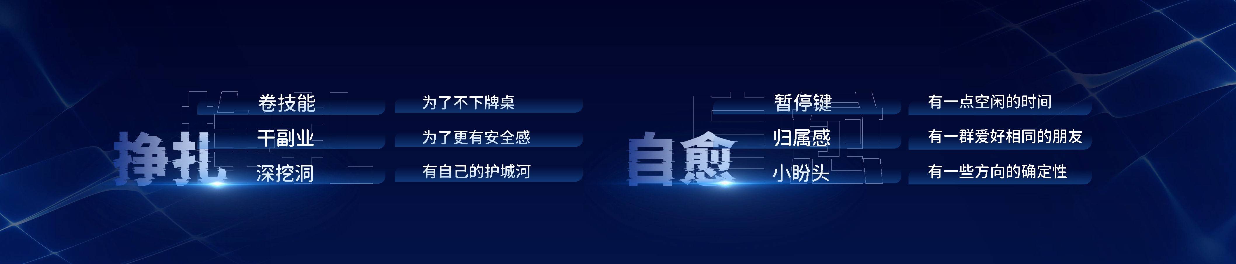 我们在挣扎里面确定了三个关键词:卷技能、干副业、深挖洞;在自愈里面也总结了三个词:暂停键、归属感、小盼头。