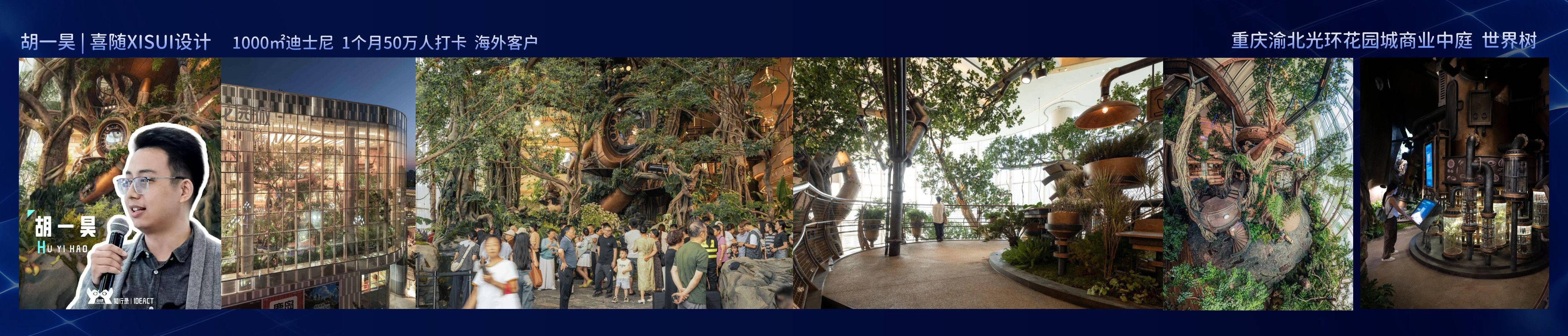 胡一昊老师设计的重庆渝北光环花园城商业中庭装置 “世界树”,被定义为 “1000 平米的迪士尼”。