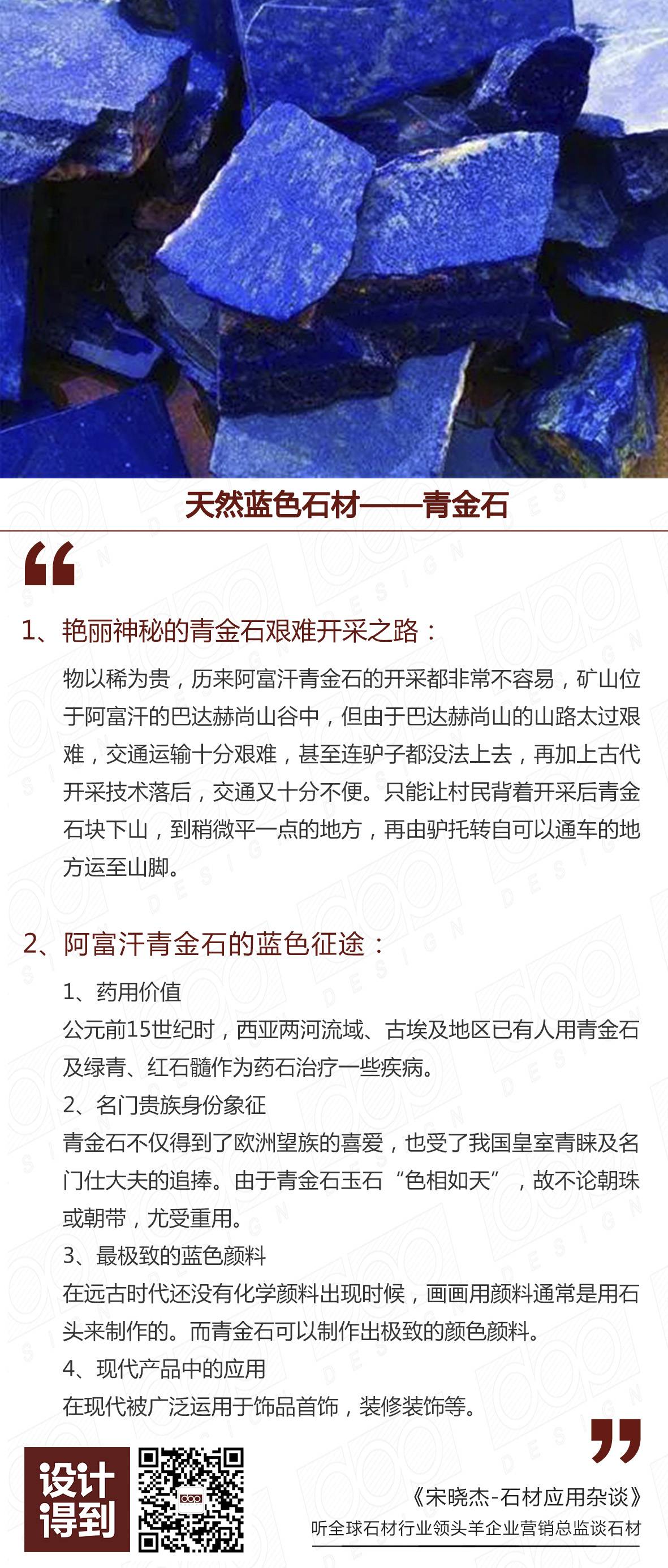 而在大自然中,蓝色是非常珍贵的颜色,因为矿藏不多,所以历来为世人所珍爱。这种矿物质是我们这期要介绍的天然蓝色石材--青金石。