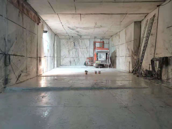 虽然在偏僻的地方,但矿山却采用了先进的洞采技术,就是在山体里开出工作面,然后用串有金刚石的钢丝绳像切豆腐一样将石材荒料切割下来,以减少损耗,提高出材率。