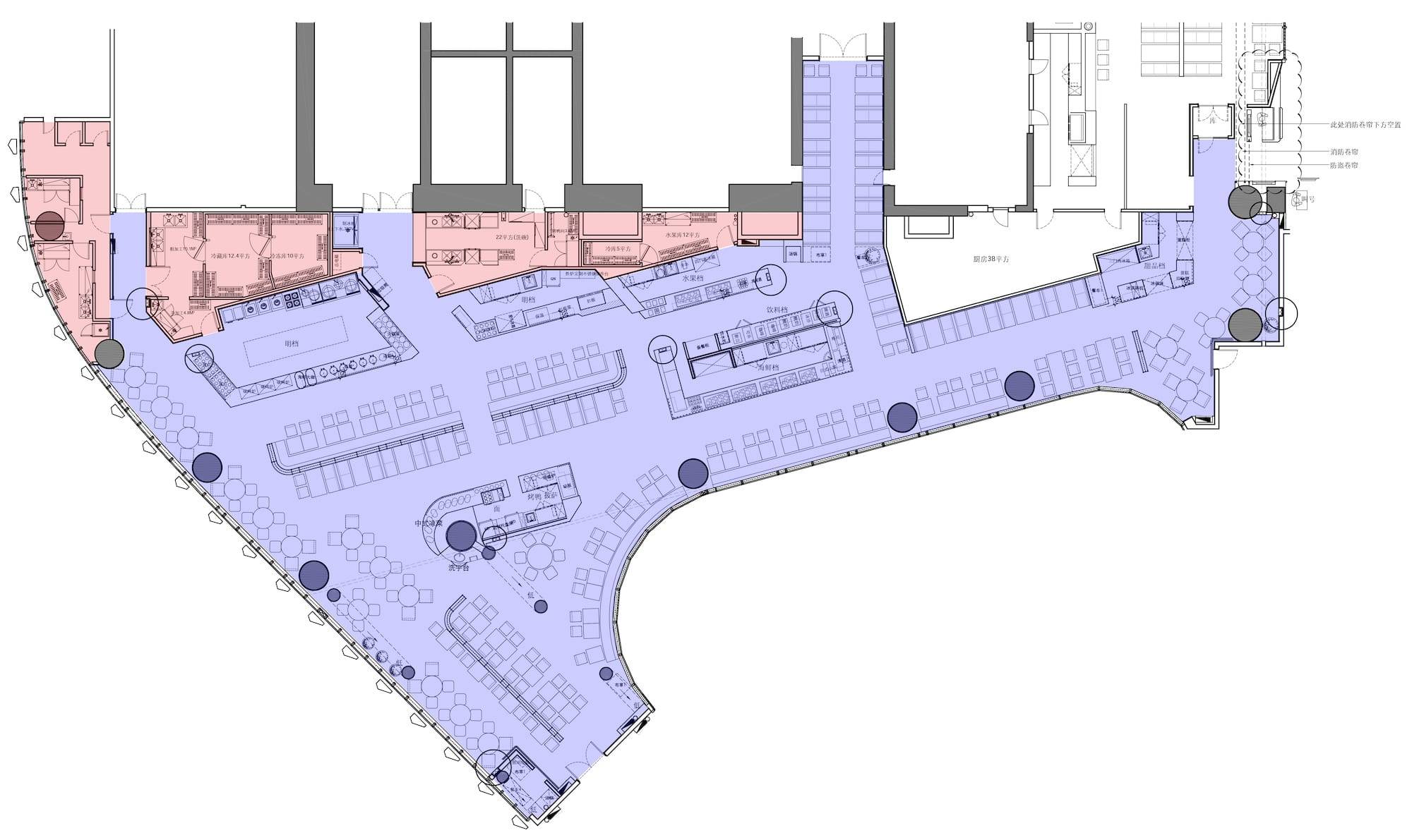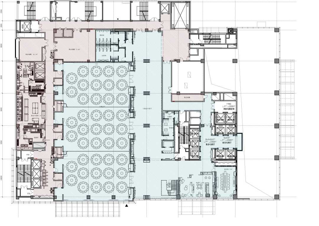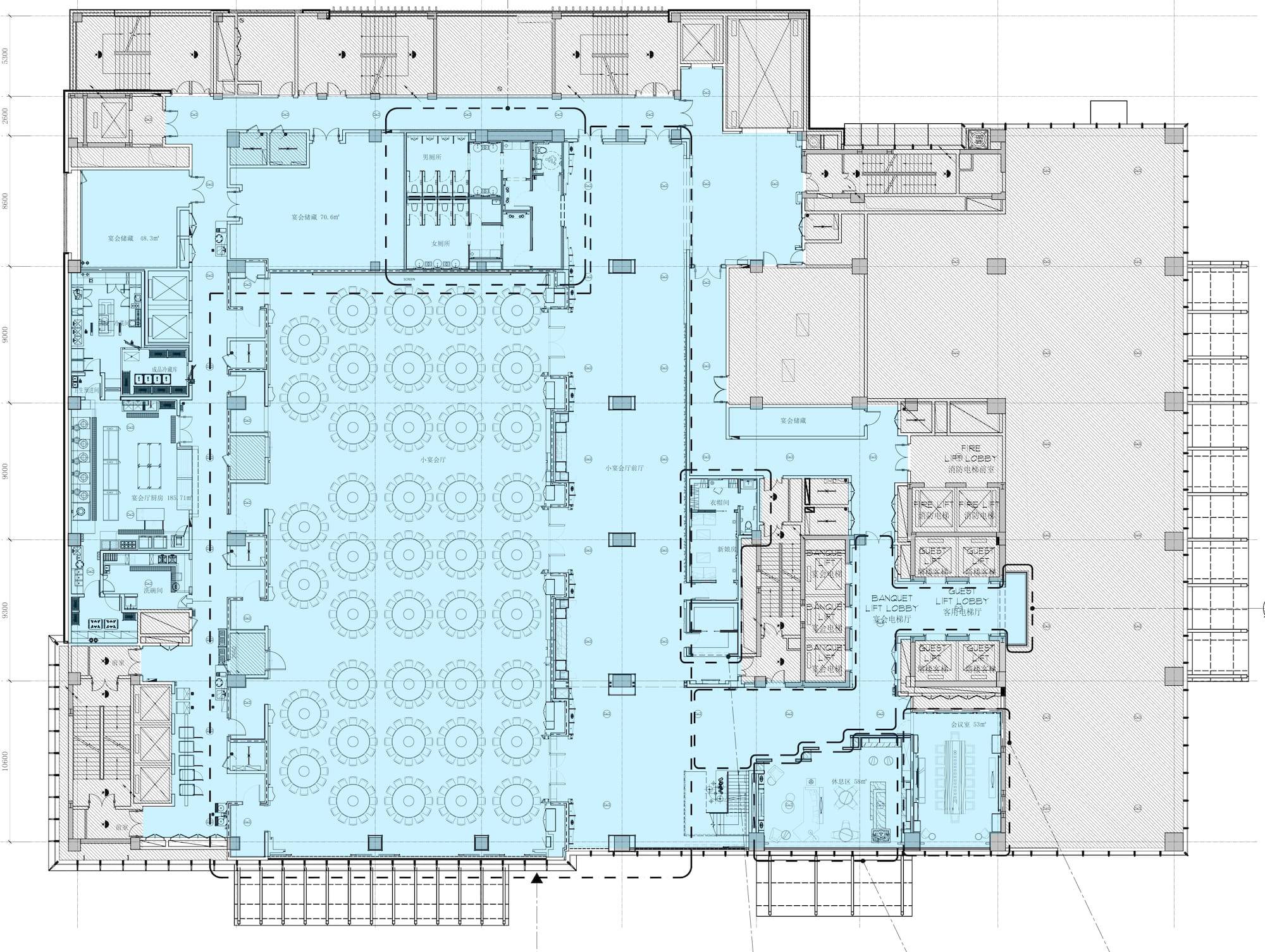 以这张酒店宴会厅图纸为例,图中被红色和蓝色阴影覆盖的部分就是我们的设计范围,在这个设计范围当中蓝色阴影覆盖的部分就是精装区(前场),也就是客人可以到达的区域。