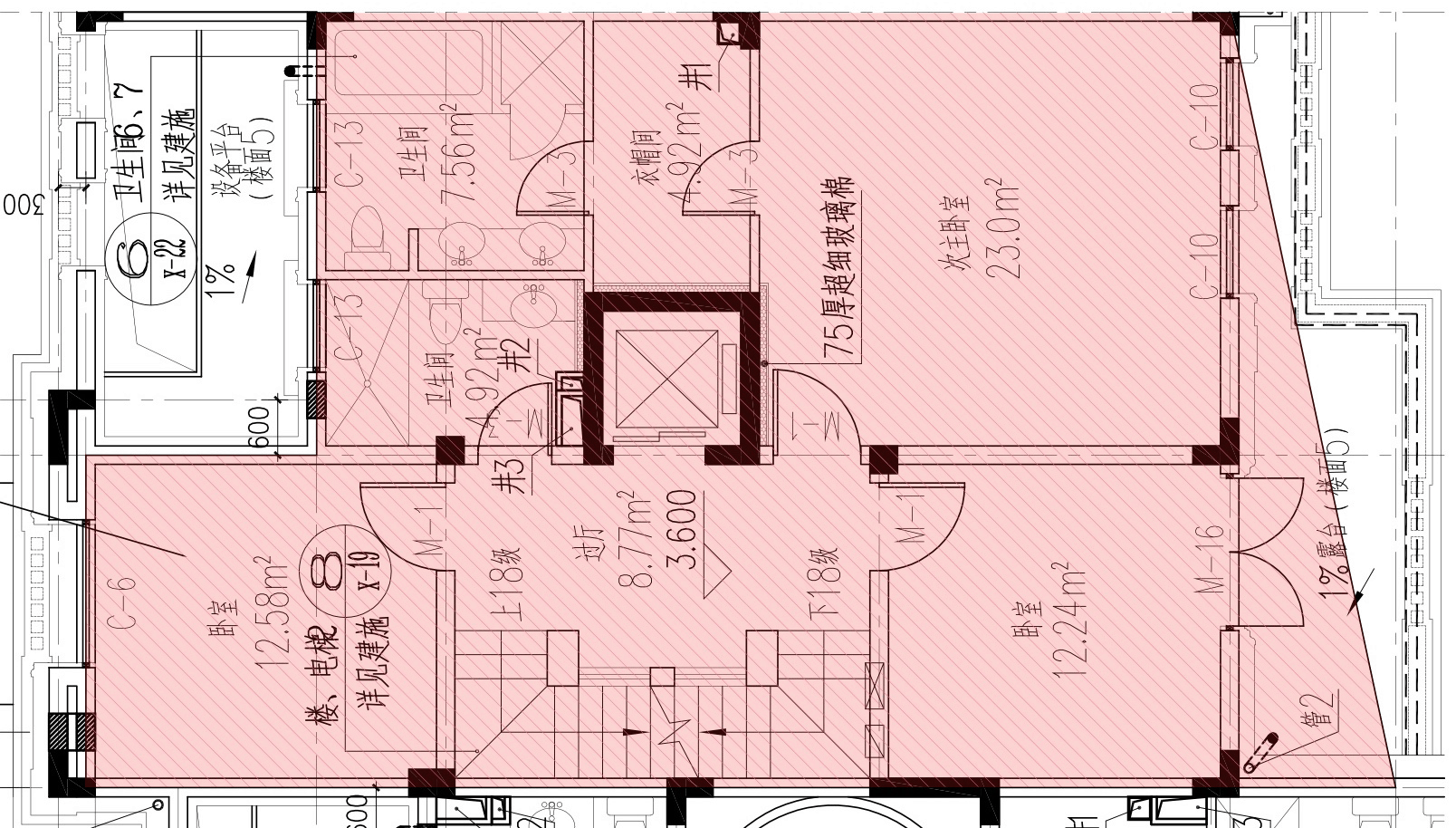 最后,如果你看的比较仔细,会发现红色区域的边界线刚好是在墙体的中间,这也是根据大多数设计公司所遵循的行规来确定的。