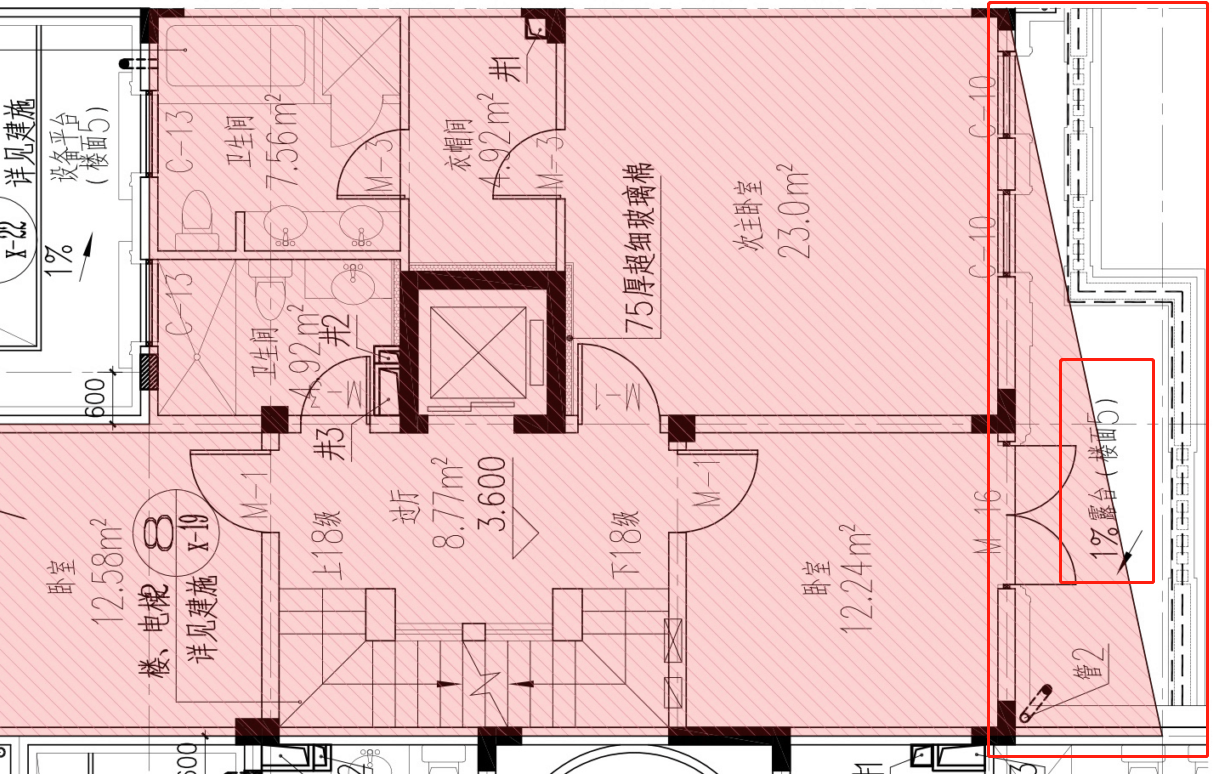 比如下面这张图,它是一套住宅项目的二楼,当中红色阴影部分就是我们所说的设计范围。这种表现形式,普遍被用于和甲方方确认项目的设计范围中。