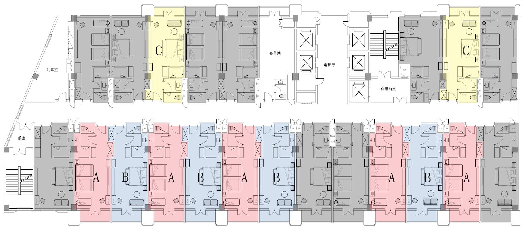 我们以上图为例,这张图是一个酒店项目客房层的平面图,图中一共有21套房间,红色覆盖的A户型算是一个标准户型,蓝色覆盖的B户型算是另外一个标准户型,黄色覆盖的C户型算是第三个标准户型,而剩下的11套房间就是我们所说的非标准户型。