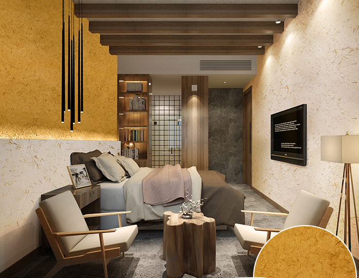 ③ 稻草漆/泥草漆:稻草顾名思义是秸秆材料,与现代装饰材料经过科技加工形成现下很流行的生态稻草漆。泥草漆温润朴素,作为空间的墙面色调,不张不扬,不急不躁。在墙面装饰上主要突出质朴,怀旧风格。