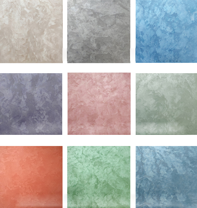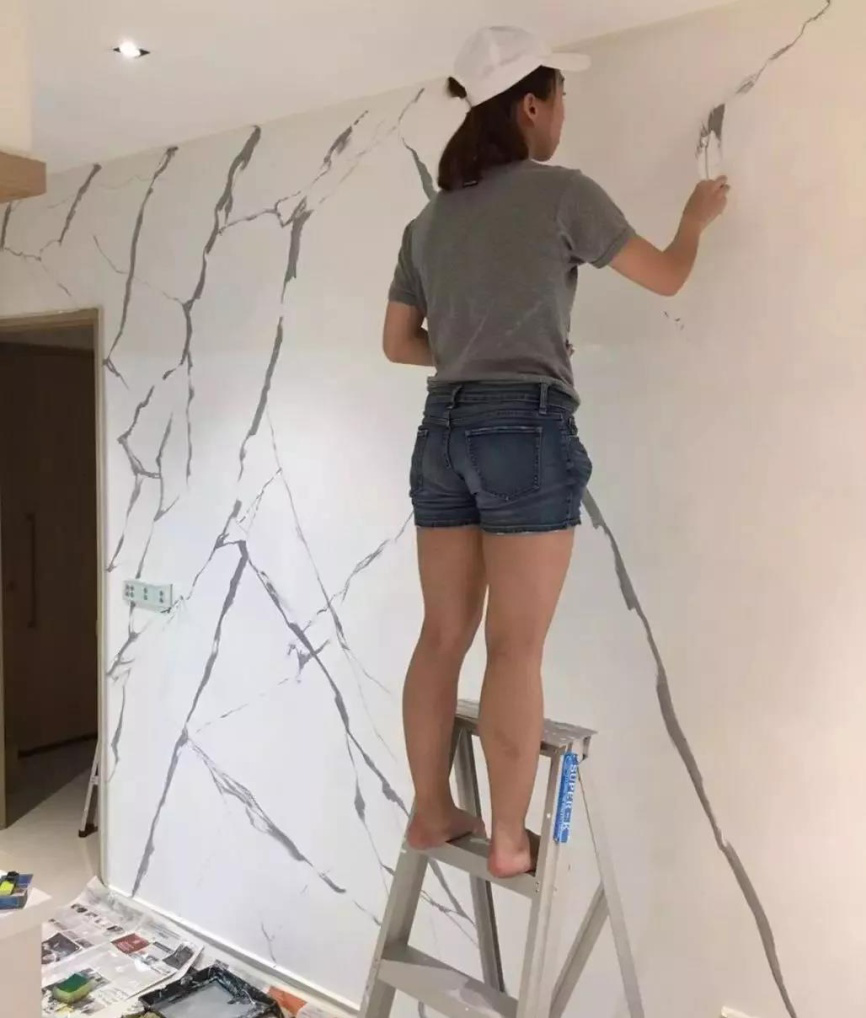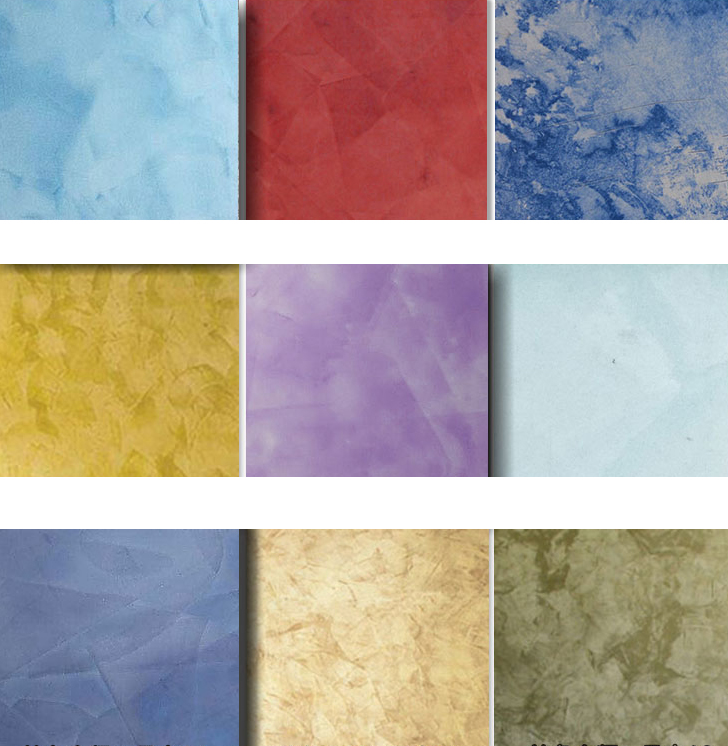 通常仿大理石或者板岩。天然大理石价格昂贵,尺寸受限。通过对丙烯酸类骨浆涂料的揉色处理,同时以各种工具辅助制作出各类天然石材的化学侵蚀痕理,仿大理石艺术涂料可以较好的模仿各类天然石材的肌理效果,是天然石材最完美的替代品。