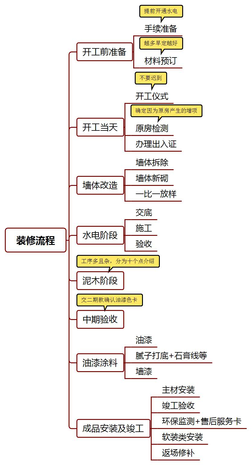 装修流程可以简单的拆分为:开工前准备→开工当天→墙体改造→水电施工→泥木阶段→中期验收→油漆涂料→成品安装及竣工验收。(会有一定的地域差,请各位同学灵活运用)。按照这个工序,我将给你详细介绍。